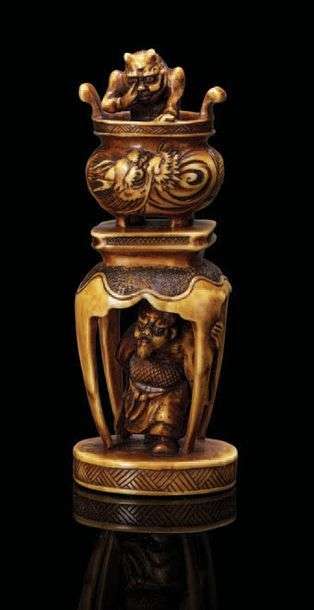 Okimono netsuke en ivoire teinté représentant Shoki caché sous une sellette sur laquelle est posé un brûle-parfum à décor de dragons, d'où émerge un Oni. Signé Ihô (?) dans un cachet rouge sur la base.