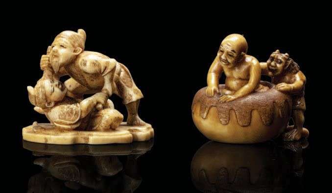 Deux netsuke en ivoire teinté et rehaussé de brun, l'un représentant un Oni grattant le dos d'un moine dans un baquet, signé Kôsen| l'autre figurant deux personnages luttant entre eux, tenant de gros pinceaux, signé dans un cartouche noir.