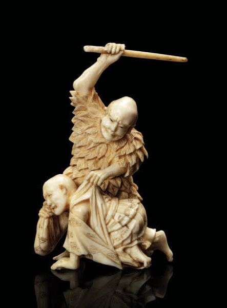 Petit okimono en ivoire, représentant un personnage vêtu d'un manteau de feuillage, brandissant un bâton pour frapper un homme à quatre pattes essuyant ses larmes.