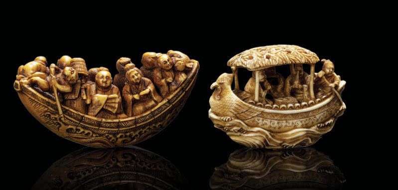 Deux netsuke en ivoire représentant des embarcations sur les flots, l'une transportant de nombreux personnages, l'autre avec trois musiciens sous un dais. Signés respectivement Tomochika et Gyokuzan.