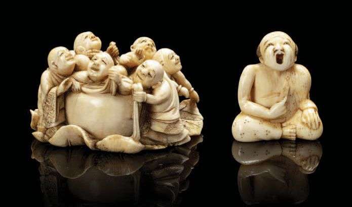 Lot comprenant un petit okimono et un netsuke en ivoire, le premier représentant six moines dont quatre se lavant dans un baquet posé sur une feuille de lotus, signé Mitsumiya (ou Kôgu)| le second figurant un personnage assis, criant, signé Gyokuyôsai.