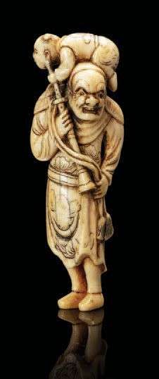 Netsuke en ivoire représentant un homme debout tenant une trompette, un enfant perché sur ses épaules. (Petites gerces)