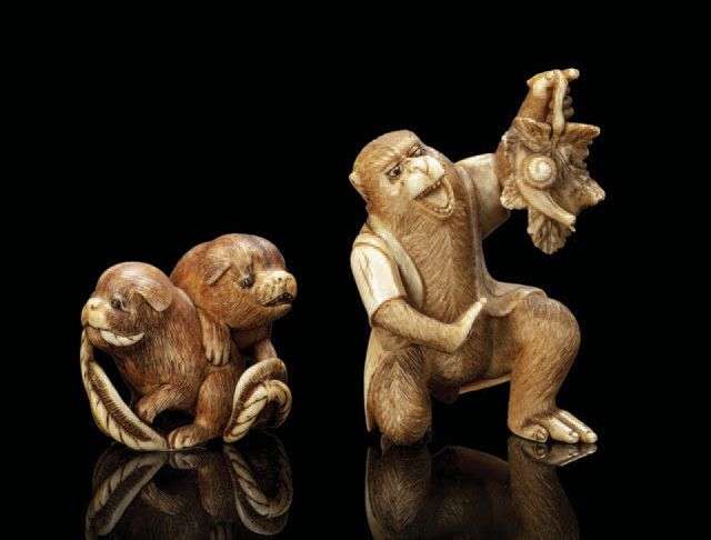 Lot comprenant un netsuke et un petit okimono en ivoire teinté, le premier représentant deux chiots jouant avec des getta, signé Minzan| le second figurant un singe vêtu d'un manteau, brandissant triomphalement une feuille sur laquelle se trouve un escargot, les yeux incrustés de corne.