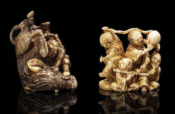 Deux netsuke-okimono teintés, l'un représentant le héros Yamato Takeru tuant le sanglier géant, signé Hôgyoku| l'autre figurant deux sennin dansant accompagnés de deux musiciens. Signé Tenzan. (Gerces au premier)
