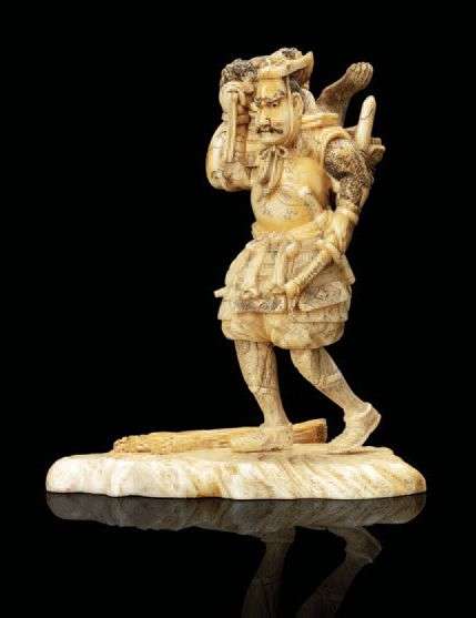 Deux okimono en ivoire, le premier représentant Minamoto no Yorimasa portant sur son dos le Nuye, animal fantastique, qu'il vient de tuer. Signé Kiyohide dans un cachet rouge.