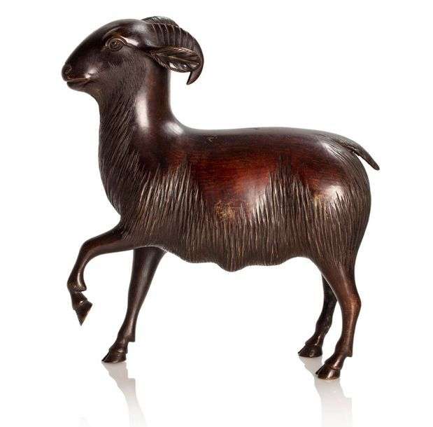 Okimono en bronze de patine brun-rouge représentant un bélier, la patte avant gauche levée.