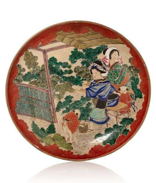 Plat en grès de kutani à décor polychrome de deux paysannes sur une terrasse auprès de deux enfants.