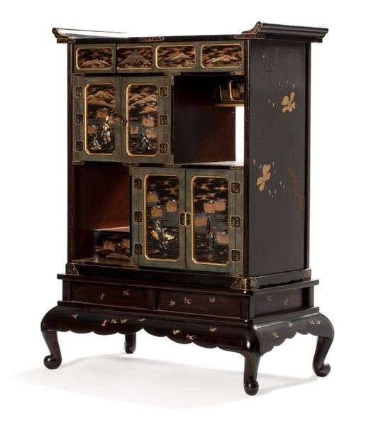 JAPON Petit cabinet à livres en bois laqué ro-iro de type shodana, sur haut piètement galbé, à trois niveaux d'étagères, les deux principaux présentant chacun une niche ouverte avec tiroirs, et deux portes à charnières ouvrant sur tablettes et tiroirs, le niveau supérieur ouvrant par quatre petits panneaux coulissants| chaque panneau à décor au laque or et polychrome de paysages de montagnes sur fond mura nashiji, dans un pourtour laqué vert, les quatre portes ornées de personnages en haut relief de shibuichi, sentoku et shakudo, partiellement doré| l'intérieur en laque nashiji, les côtés et le sommet du meuble orné en de motifs floraux au lque or| les ferrures en shakudo (ou laquées noir), à décor de motif floraux or et cernées d'un filet doré. H. 117 cm -L. max: 87 cm - P. 40 cm