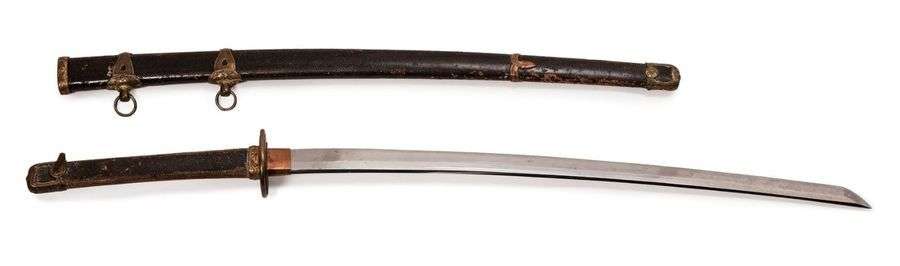 Tachi à lame en shinogi-zukuri, hamon en suguha, nakago à un mekugi ana, non signé. Monture en same brun, avec éléments en cuivre à décor de fleurs de cerisiers. (Petits accidents et usures au fourreau, usure de la tsuka, manque le tressage)