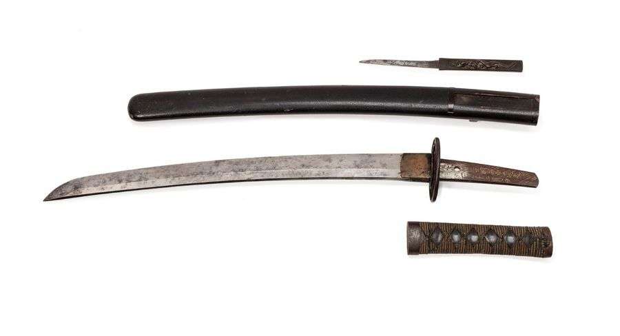 Wakizashi à lame en shinogi zukuri, hamon indiscernable, nakago à un mekugi ana, signé Fumiaki juzô Yonezawashi Katô Hachirô Fujiwara Tsunatoshi, et daté Tenppô 12 (1841). Fourreau laqué noir avec kogatana à décor de dragon| sukashi tsuba en fer, fuchi-kashira en fer sans décor. (Lame salie, petits chocs sur le tranchant| petits accidents au fourreau, manque les menuki, fuchi-kashira oxydés)