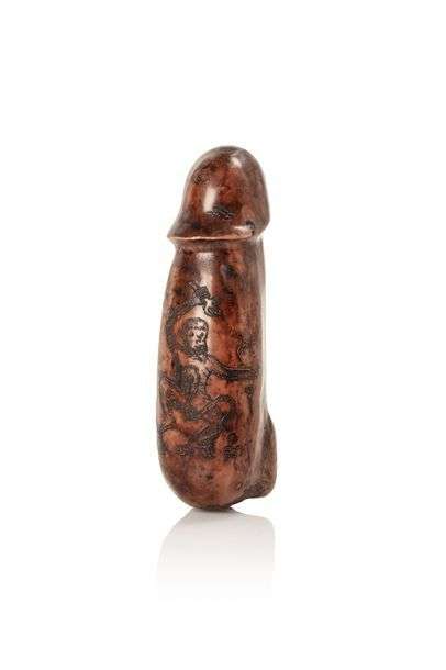 Phallus en stéatite brun-rouge, orné d'un singe.