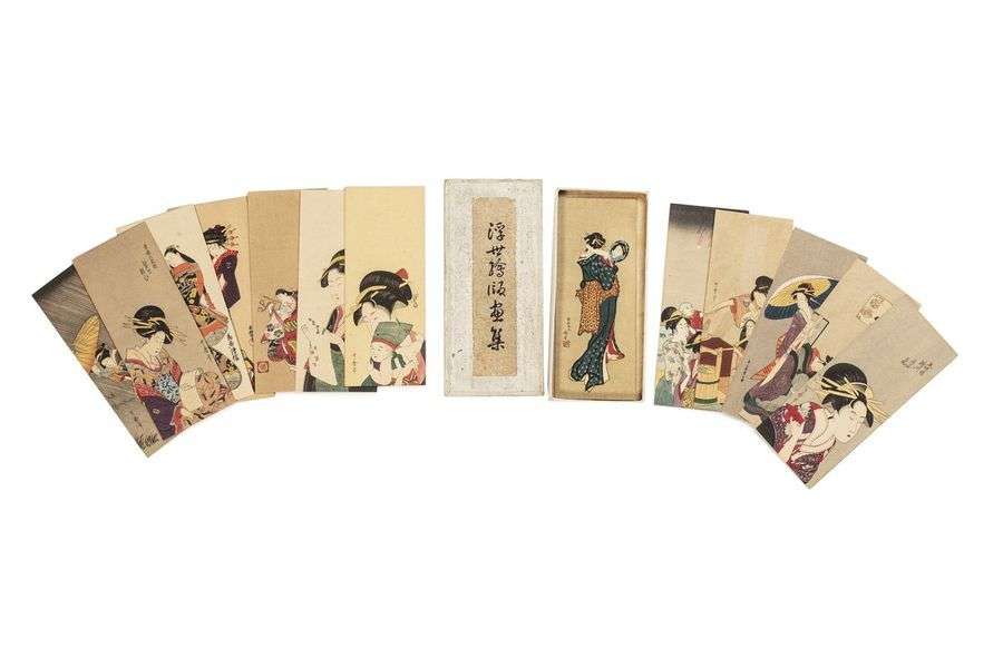 Ensemble de treize petites enveloppes étroites verticales, à décor reprenant des estampes de divers artistes, dont essentiellement Utamaro, contenues dans une petite boîte en carton.