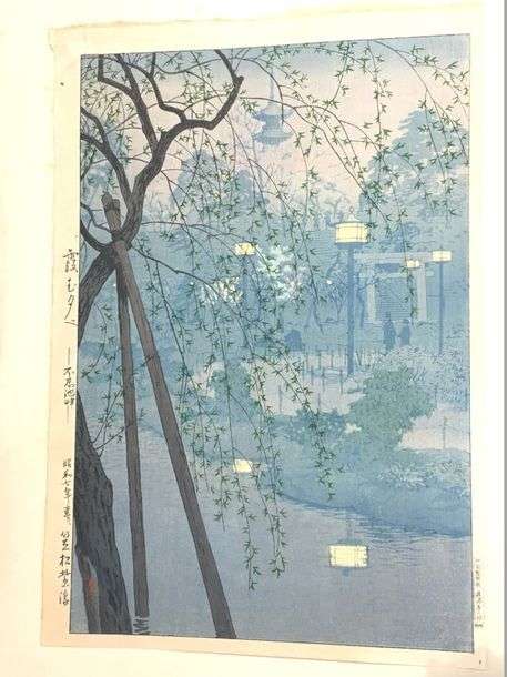 Deux estampes shin-hanga de format oban tate-e, l'une par Shiro Kasamatsu (1898-1991), soir brumeux sur l'étang de Shinokazu à Nara, datée Showa 7, 1932| l'autre par Eisho Narazaki (1864-1936), à l'intérieur du temple de Kannon à Asakusa, datée Showa 7, 1932. (Légèrement jaunies)