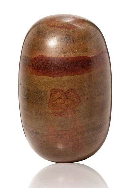 Lingam ovoïde en pierre veinée brun-vert et rouille.