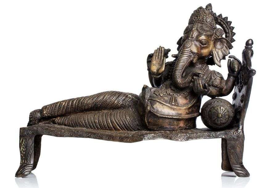 Grand sujet en bronze représentant le dieu Ganesha à quatre bras, couronné et auréolé, allongé de côté sur une banquette, trois mains tenant ses attributs, la quatrième en abhaya mudra, absence de crainte.