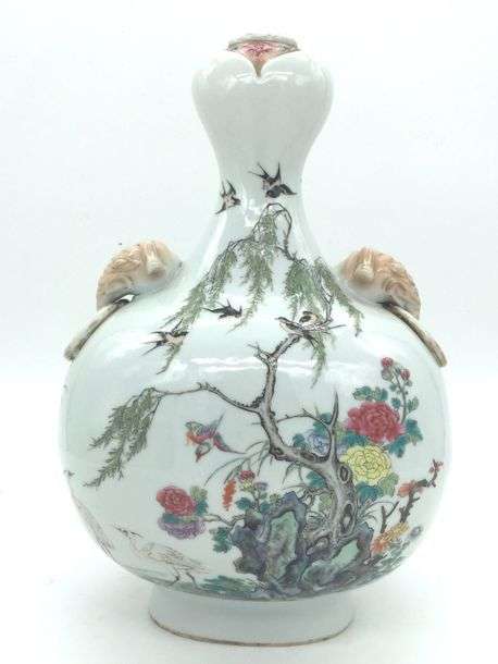 Chine XIXe siècle, Vase en porcelaine à décor émaillé d'hirondelles parmi des pivoines. Deux anses formées par des têtes d'éléphants retenant des anneaux.