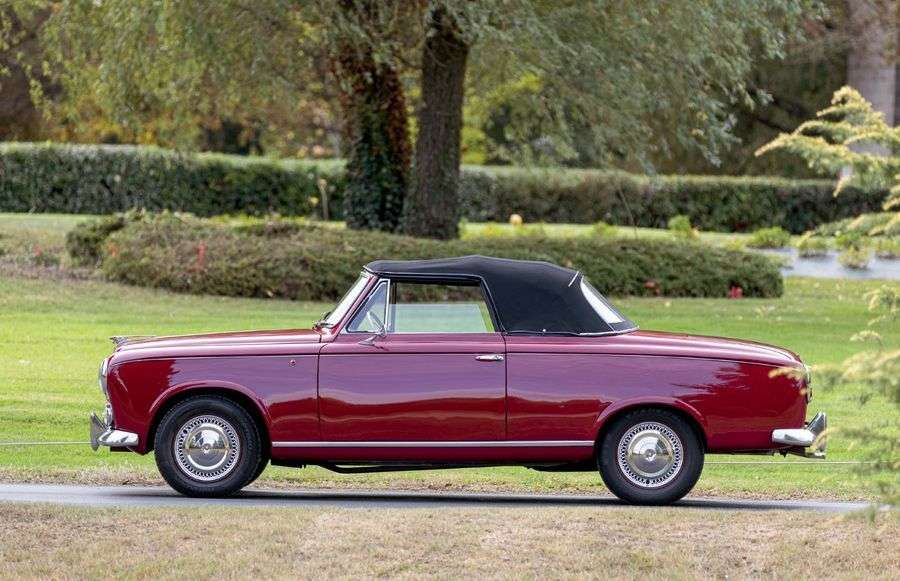 Présentée le 20 avril 1955 à Paris, la Peugeot 403 fit entrer la firme de Sochaux dans une nouvelle ère. Sa carrosserie signée Pininfarina inaugure une longue collaboration entre le constructeur français et le designer italien. Esthétiquement, elle marque une rupture avec la désormais vieillissante 203 et le traditionnel format trois corps. A la fois sobre et élégante, sa ligne moderne rencontrera un franc succès populaire. Avec une conception mécanique simple, la 403 sera un modèle de fiabilité, n’utilisant principalement que des éléments éprouvés. Elle sera de plus commercialisée avec un moteur diesel Indenor en 1959, devenant alors la première voiture française diesel de série. Le cabriolet 403 entre dans la gamme en 1956. Equipée du moteur 8cv, la 403 cabriolet se voit dotée d’un carburateur Solex ainsi que d’une nouvelle culasse faisant grimper sa puissance à 61 chevaux tout en conservant sa robustesse originelle. Son allure distinguée séduira un certain Peter Falk, interprète du Lieutenant Columbo, qui résoudra ses enquêtes au volant de son infatigable 403 Cabriolet. Avec seulement 2 050 exemplaires mis en circulation contre plus de 1 200 000 berlines, la Peugeot était déjà rare à l’époque et a fortiori aujourd’hui.