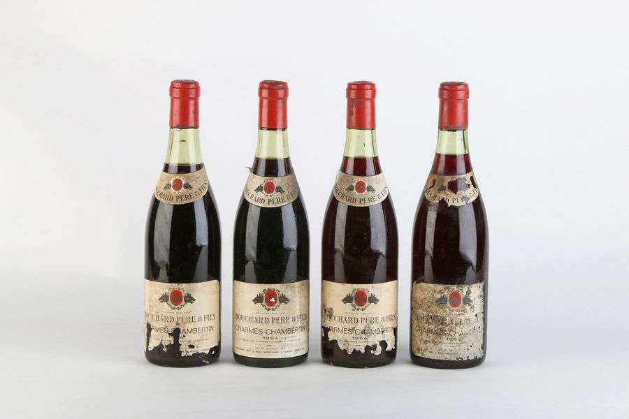 4 B CHARMES-CHAMBERTIN (Grand Cru) 1 à 2,5| 2 à 3 et 1 à 3,7 cm| 1 e.t.h| 3 e.q.i. dont 1 avec 1 millésime partiellement lisible "19?4"| 3 collerettes Bouchard Père & Fils sales et 1 abimée| 1 c.c. légères sommet| 1 légèrement suintante - 1964 - Bouchard Père & Fils