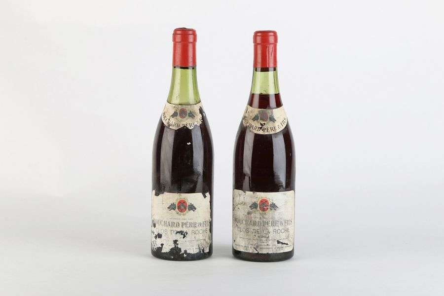 2 B CLOS DE LA ROCHE (Grand Cru) 1 à 3 et 1 à 4,5 cm| 1 e.t.a| 1 e.q.i. avec le millésime partiellement lisible et donc supposé| collerettes Bouchard Père & Fils abimées| 1 bouchon très légèrement engagé - 1962 - Bouchard Père & Fils