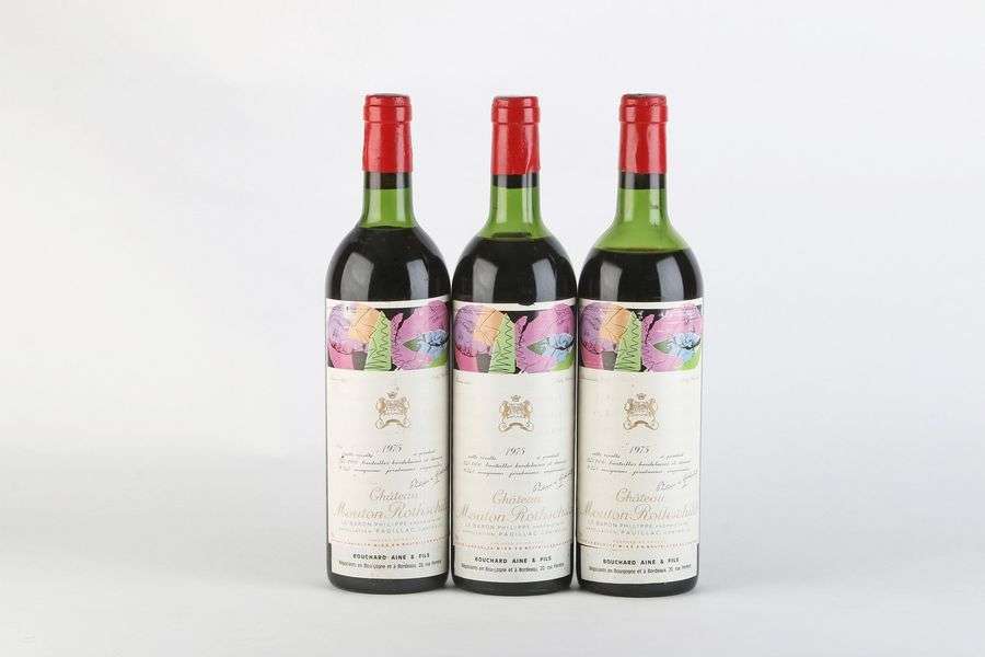 3 B CHÂTEAU MOUTON ROTHSCHILD (1 T.L.B| 1 H.E| 1 M.E| e.l.a| 1 accroc bas de jupe) - 1975 - GCC1 Pauillac