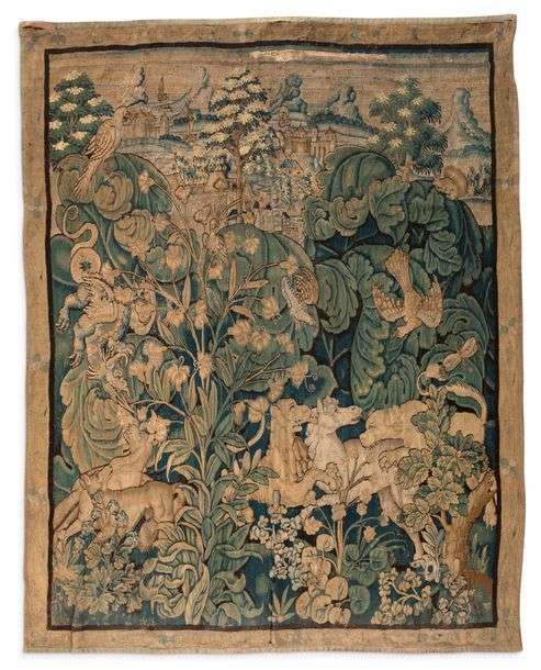 ATELIERS DE LA MARCHE, XVIE SIÈCLE Rare fragment de verdure à décor de feuilles de type «aristoloche», appelées également «feuilles de choux». Notre tapisserie présente une frondaison de feuilles de chou dentelé s'épanouissant sur toute la surface, animée d'une scène de lions attaquant des licornes et d'oiseaux en vol. L'arrière-plan se compose d'une vue de village et d'arbres en fleurs. Bordure postérieure (XIXe siècle) Dimensions: 267 x 225 cm