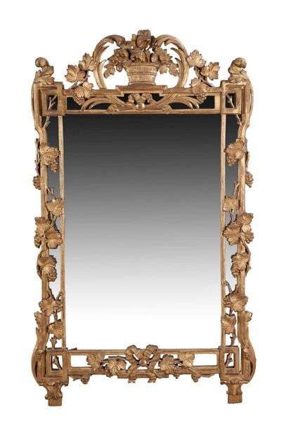 MIROIR À PARECLOSES rectangulaire en bois sculpté et stuc doré, surmonté d'un panier fleuri et orné d'un réseau de pampres de vignes. Miroir au mercure XVIIIe siècle