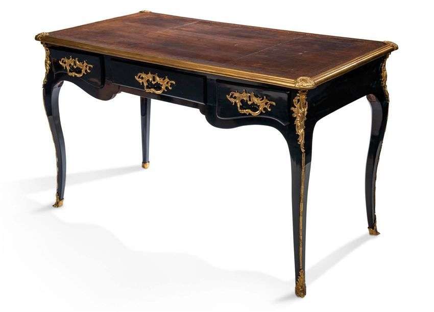 BUREAU PLAT en bois laqué noir, la ceinture ouvre en façade par trois tiroirs et repose sur quatre pieds cambrés à côtes pincées. Riche ornementation de bronzes ciselés dorés tels que: poignées de tirage, chutes et sabots. Plateau gainé de cuir doré aux petits fers ceint d'une lingotière de laiton Estampillé Reizell et marques de jurande.