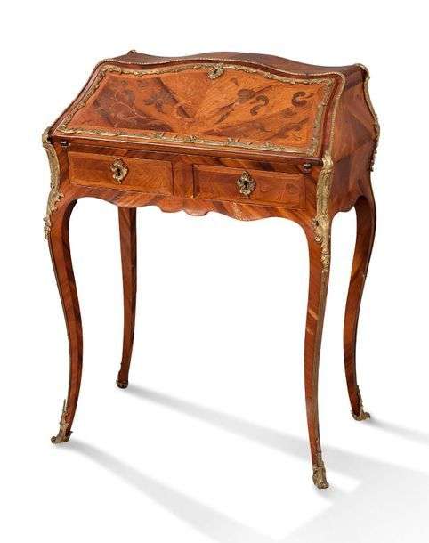 ATTRIBUÉ À MIGEON Ravissant petit bureau de pente en placage toutes faces de bois de rose et de satiné marqueté en ailes de papillons et à décor de feuillages. Le corps bombé ouvre en facade par un abattant découvrant trois petits tiroirs et un casier. La ceinture mouvementée ouvre par deux tiroirs en façade et repose sur quatre pieds sinueux à côtes pincées. Belle ornementation de bronzes ciselés dorés tels que encadrement, chutes, sabots, poignées de tirage, entrées de serrure à motif d'agrafes feuillagées et rinceaux. Epoque Louis XV Parties anciennnes H: 87 - L: 66 - P: 38 cm Soulèvement et manques au placage. Fond postérieur