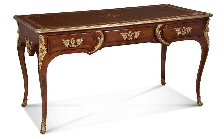 BUREAU PLAT en placage de bois de violette toutes faces ouvrant en façade par trois tiroirs. Les montants, poignées de tirage, tiroirs et culots s'ornent de bronzes ciselés dorés à motifs d'agrafes et feuilles d'acanthe. Le plateau est gainé d'un cuir marron doré aux petits fers, il est ceint d'une lingotière de laiton. Estampillé MigeonEpoque Louis XV H: 78 - L: 145,5 - P: 72 cm Enfoncements, fentes au placage, restaurations