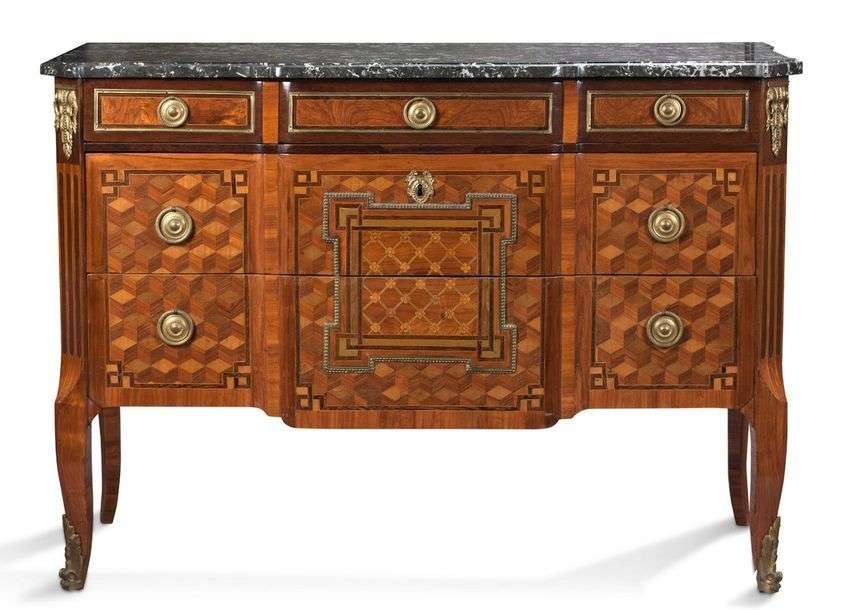 IMPORTANTE COMMODE à ressaut central en placage de palissandre, bois de rose, satiné et bois verdi, marqueté de cubes sans fond et de filets à grecque. Elle ouvre en façade par cinq tiroirs sur trois rangs, les montants à pans coupés reposent sur des pieds cambrés. Ornementation de bronze ciselés et dorés tels que: chutes, entrées de serrure, poignées de tirage, encadrement et sabots. Plateau de marbre gris Saint-Anne. Estampillée à deux reprises P. H MEWESEN et marque de jurande.