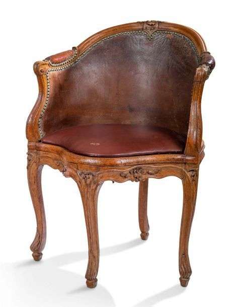LARGE FAUTEUIL DE BUREAU à dossier gondole canné et bois naturel mouluré sculpté de fleurettes reposant sur quatre pieds cambrés. Garniture de cuir clouté. Estampillé J Nadal