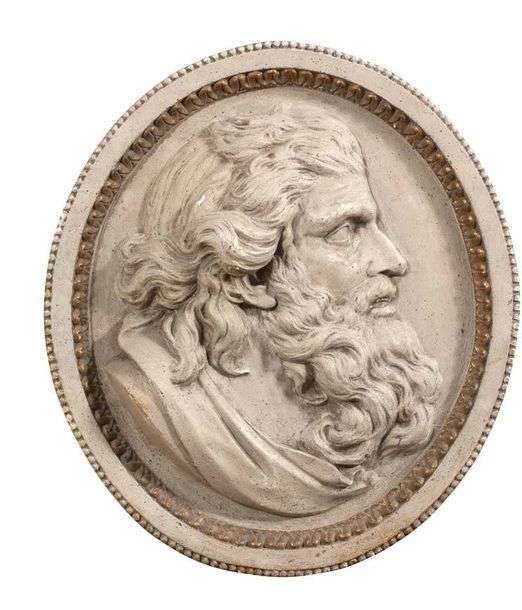 PAIRE DE MÉDAILLONS en plâtre ornés de profils masculins antiques en haut relief soulignés d'une frise de feuilles d'eau XIXe siècle