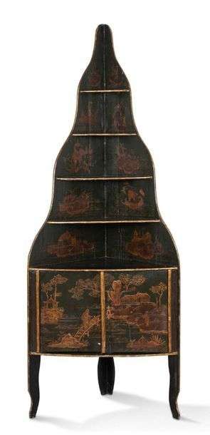 GRANDE ENCOIGNURE en vernis Martin à décor de paysages lacustres et de pagodes. La partie supérieure présente cinq étagères et la partie inférieure ouvre par deux vantaux. XVIIIe siècle H: 190 - L: 73 - P: 35 cm Usures à la laque, manques, restaurations