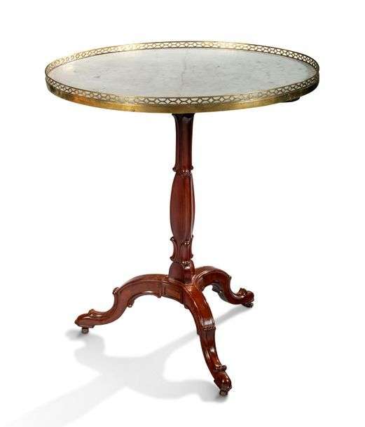 PETIT GUÉRIDON en acajou mouluré à fût balustre reposant sur un piètement tripode cambrés terminés par des roulettes. Plateau de marbre blanc encastré ceint d'une lingotière de laiton ajouré. XVIIIe siècle Estammpillé CANABAP et marque de jurande JME