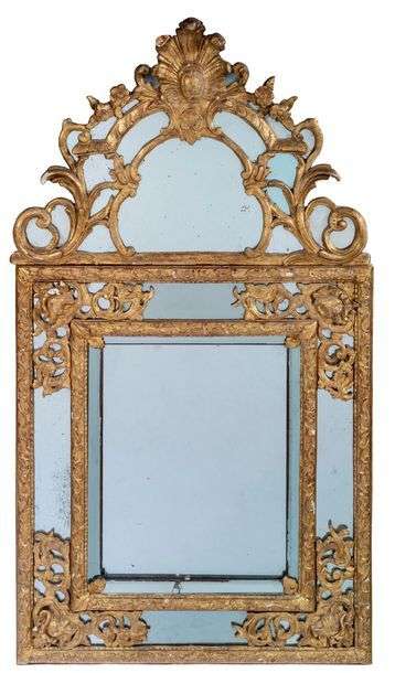MIROIR À PARCLOSES en bois et stuc mouluré, sculpté et doré. Le fronton à fond de glace est orné d'une coquille d'où s'échappent des fleurettes et entrelacs. On retrouve ces mêmes entrelacs sur chaque écoinçon du miroir. XVIIIe siècle