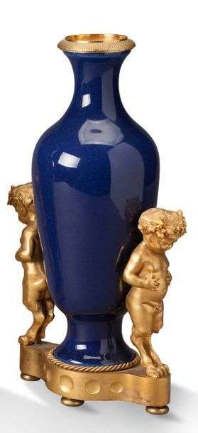 PAIRE DE VASES BALUSTRE en porcelaine à fond gros bleu à monture en bronze ciselé doré flanqués de deux jeunes satyres adossés. Ils reposent sur une base oblongue ornée de besants, quatre petits pieds aplatis. Travail français du XVIIIe siècle H: 27,5 cm