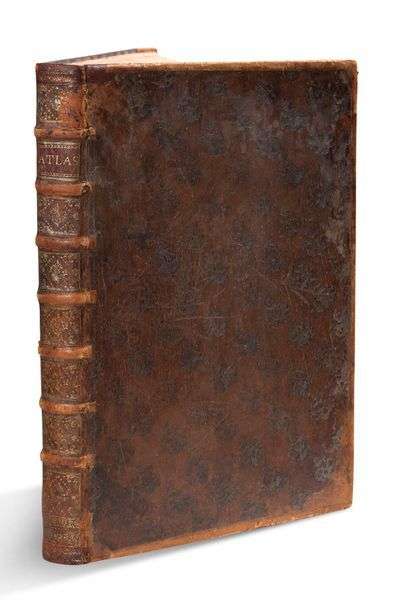 Reliure de plein veau havane tacheté, dos à 7 nerfs cloisonné et fleuronné, pièce de titre de cuir rouge «Atlas», tranches rouges, gardes de papier marbré tourniqué (gardes renouvelées) (restaurations anciennes à la reliure| épidermures, nerfs avec épidermures| quelques restaurations intérieures (papier japon en renforcement| quelques déchirures aux plis de certaines cartes). Dimensions: 643 x 505 mm.