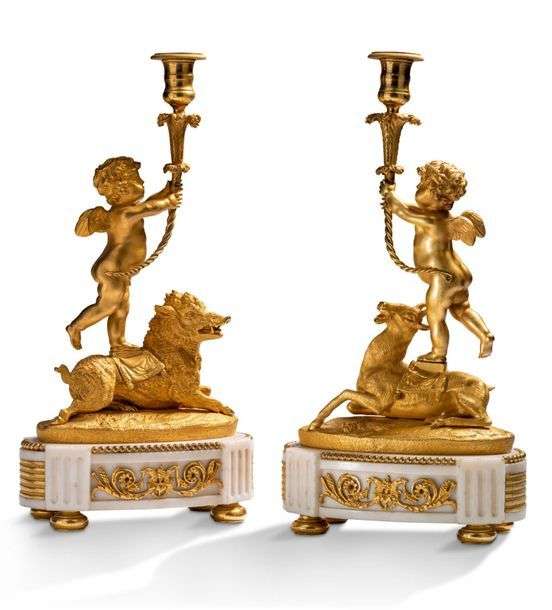 PAIRE DE FLAMBEAUX en bronze ciselé, doré en partie amati à décor cynégétique de putti reposant l'un sur un sanglier, l'autre sur un cerf. Base oblongue en marbre blanc compartimenté ornée de grattoirs et motifs de têtes d'aigle retenant des composition feuillagées| elle termine par quatre pieds boule aplatis. Epoque Directoire H: 32 - L: 16 cm Petits éclats au marbre et manques à la dorure