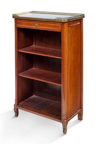 PETITE BIBLIOTHÈQUE en acajou massif à façade ouverte découvrant un tiroir et trois casiers. Plateau de marbre blanc encastré ceint d'une lingotière en laiton ajouré. Estampillée J. F Dubut et marques de jurandeDeuxième moitié du XVIIIe siècle H: 103,5 - L: 56,5 - P: 31 cm