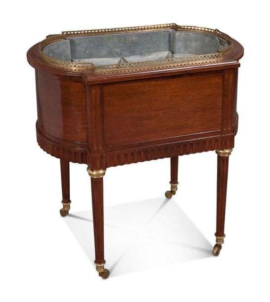 JARDINIÈRE OBLONGUE en acajou et placage d'acajou. La ceinture est moulurée d'une frise de denticules, elle repose sur quatre pieds fuselés cannelés terminés par des roulettes. Lingotière ajourée bagues et sabots de laiton. Munie de ses trois bassins en zincEpoque Louis XVI H: 76 - L: 45 - P: 77 cm Rayures