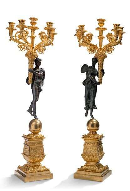 PAIRE DE GRANDS CANDÉLABRES en bronze ciselé doré à cinq bras de lumière ornés d'acanthes et jaillissant de cornes remplies de fruits portées par la figure de Mars et Vénus en bronze patiné. Ils se tiennent sur des sphères reposant sur une base à section carrée ornée de cornes d'abondance, feuilles d'acanthe et caducée. XIXe siècle