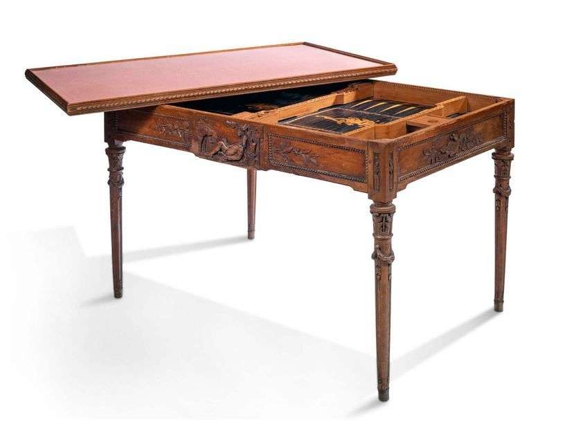 TABLE TRIC-TRAC en noyer sculpté et marqueterie de bois variés. Sur fond de feuillages, la ceinture est ornée en façade d'une colonne cannelée, de guirlandes de lauriers, d'instruments géométriques et d'un médaillon chiffré «LOB». Sur l'arrière, un homme assoupi est sculpté. Dans un encadrement de frise de perles, les côtés de la ceinture reçoivent à gauche, un décor de coeur enflammé percé de flèches et à droite, un oiseau tenant dans son bec un phylactère inscrit «LIBERTAS». La table repose sur quatre pieds fuselés à décor d'acanthes et de guirlandes de laurier. Le plateau présente en marqueterie un damier, et de part et d'autre, un décor de cartes à jouer. Travail du sud de la France ou d'Italie Période néoclassique, fin du XVIIIe siècle H: 70,5 - L: 99 - P: 66 cm Fente, accidents, manques