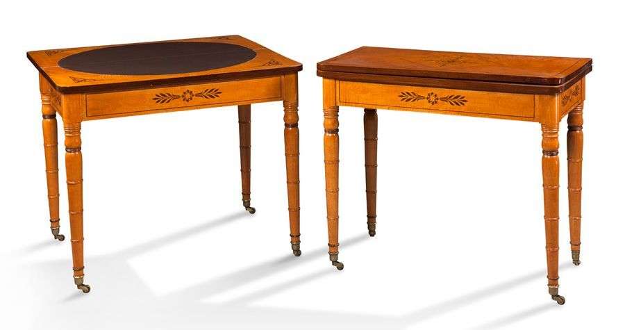 PAIRE DE TABLES À JEUX en placage d'érable flammé à motifs marquetés géométriques. Le plateau s'ouvre et découvre la surface de jeu. Elles reposent sur quatre pieds balustre terminés par des roulettes. Epoque Charles X H: 74,5 - L: 83 - P: 40,5 cm Plateau ouvert: P: 82 cm