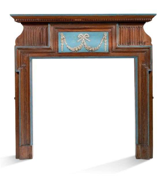 MANTEAU DE CHEMINÉE en pin mouluré et rechampi bleu dans le goût de la porcelaine de Wegdwood à motifs de noeuds rubannés d'où s'échappent des guirlandes de fleurs. Milieu du XIXe siècle