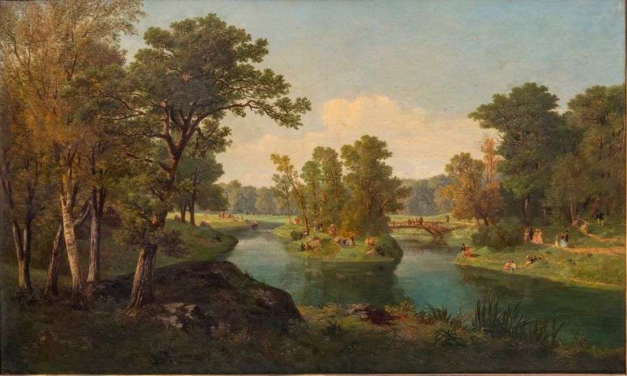 Promeneurs au Bois de Boulogne sur sa toile d'origine Signé en bas à droite "L. MELLE" et situé sur le châssis à l'arrière.