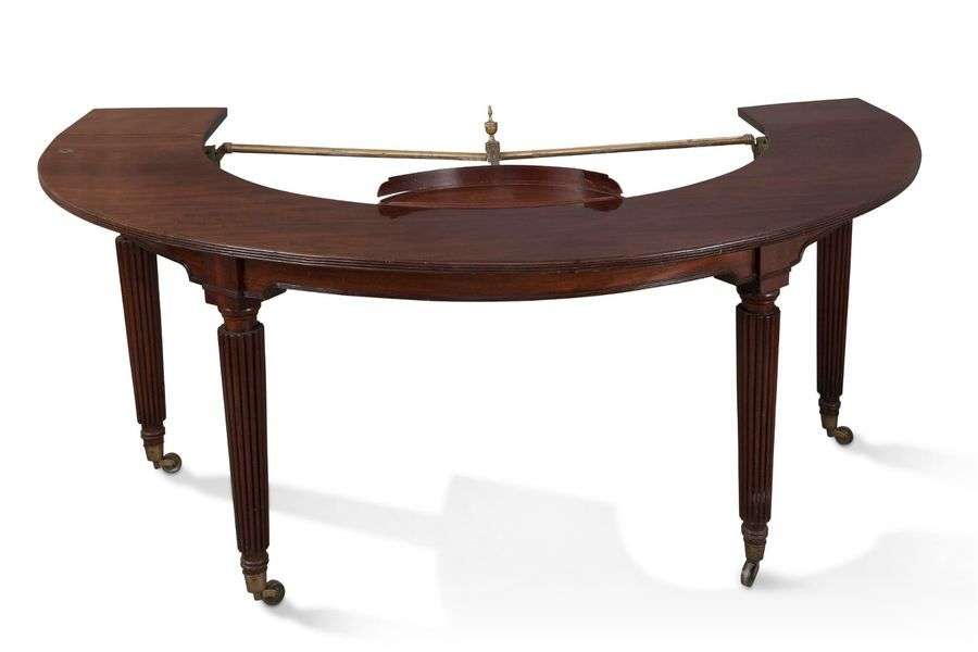 TABLE EN FER À CHEVAL en acajou à plateau tournant soutenu par une barre de laiton doré. Elle repose sur quatre pieds fuselés cannelés terminés par des roulettes. Travail anglais du XIXe siècle H: 74 - L: 183 - P: 117 (93 sans les rabats) cm Accidents, rayures, chocs. On joint un plateau permettant de fermer la table.