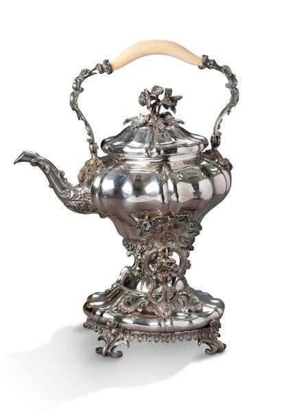 SAMOVAR en métal argenté et bronze ciselé à panse godronnée et décor de feuillages et fleurettes. Anse à prise en ivoire (restaurée).