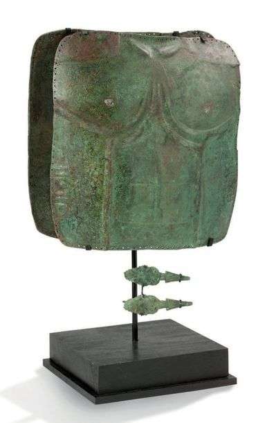 Les reliefs anatomiques sont rendus de manière stylisée soulignant ainsi une musculature puissante. Il ne demeure plus de trace du système d'attache entre les deux parties. L'ensemble est agrémenté d'un ceinturon dit de type italique. Une longue bande de bronze souple sans aucun décor. Deux agrafes en feuilles de type