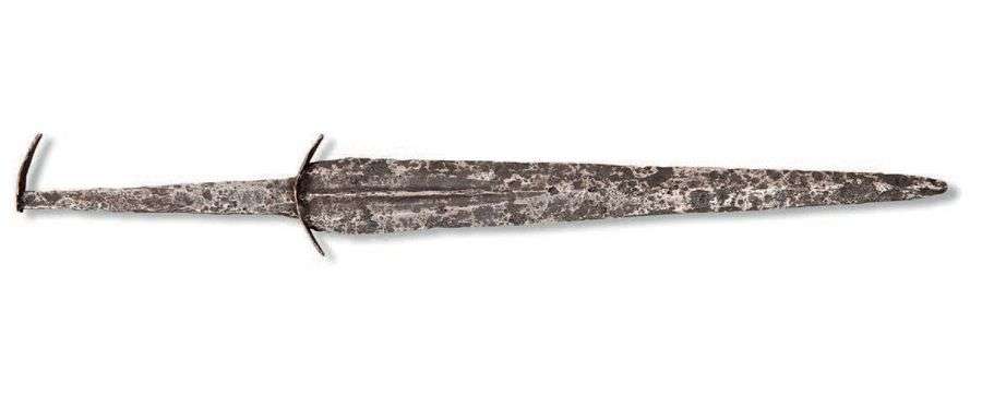 Garde à quillons infléchis. Calotte avec manque, infléchie. Lame à séction losangique, double tranchant et deux gouttières.