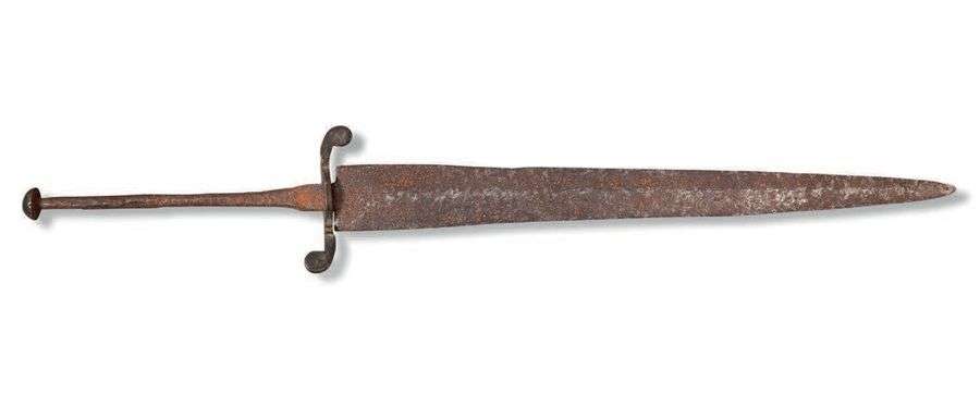Monture en fer. Quillons courts, infléchis et asymétriques, finissant chacun en boule aplatie.